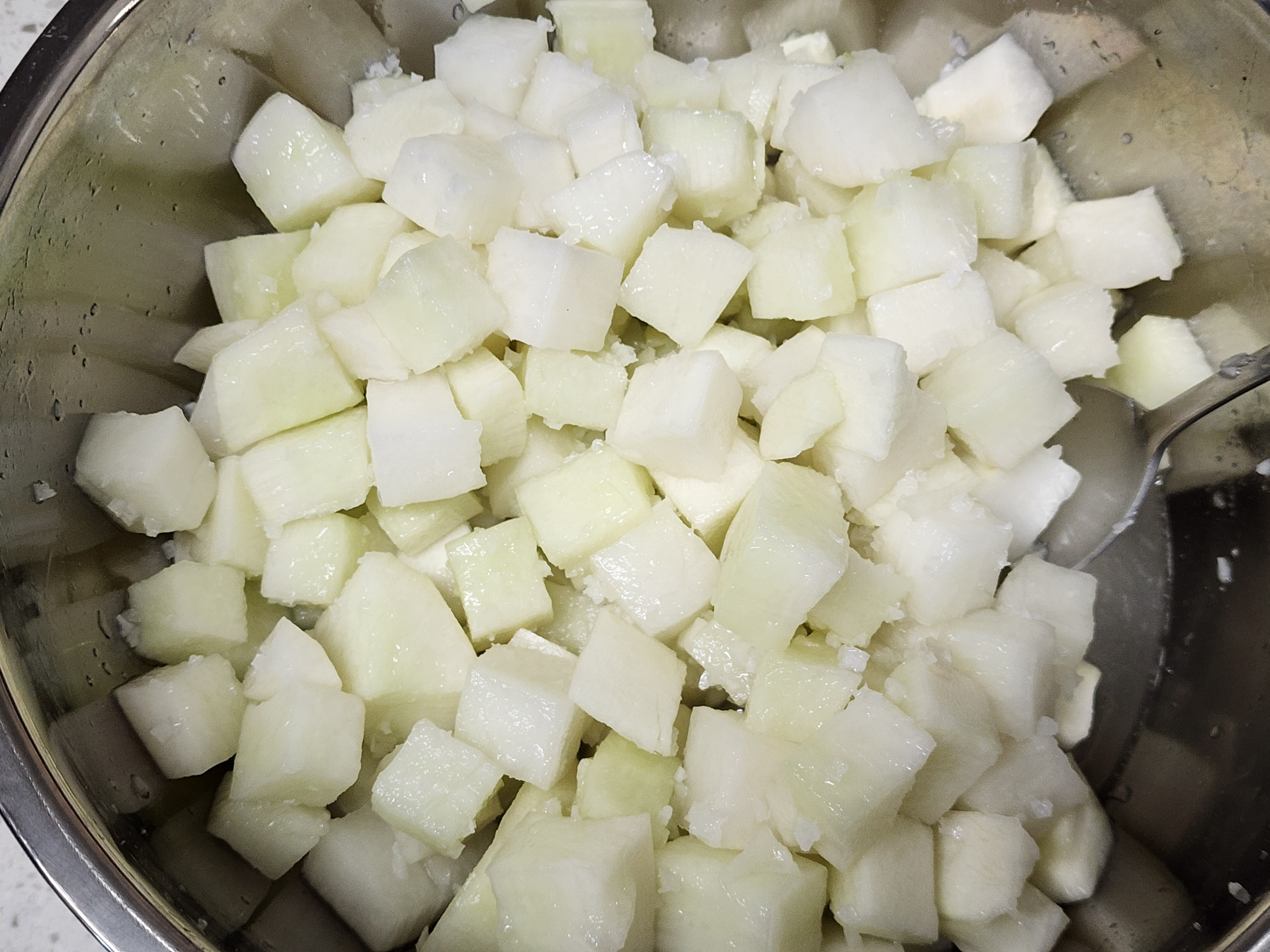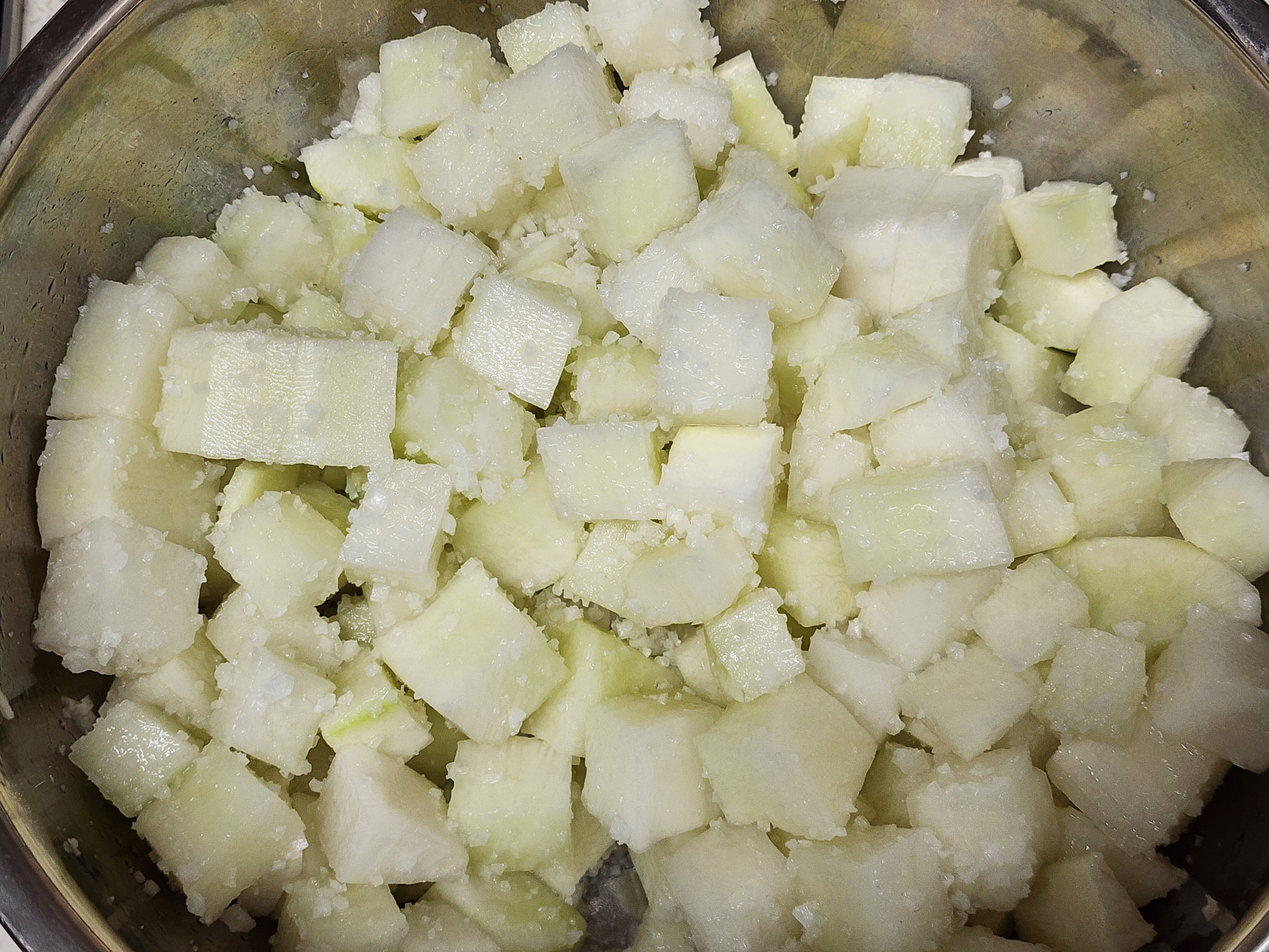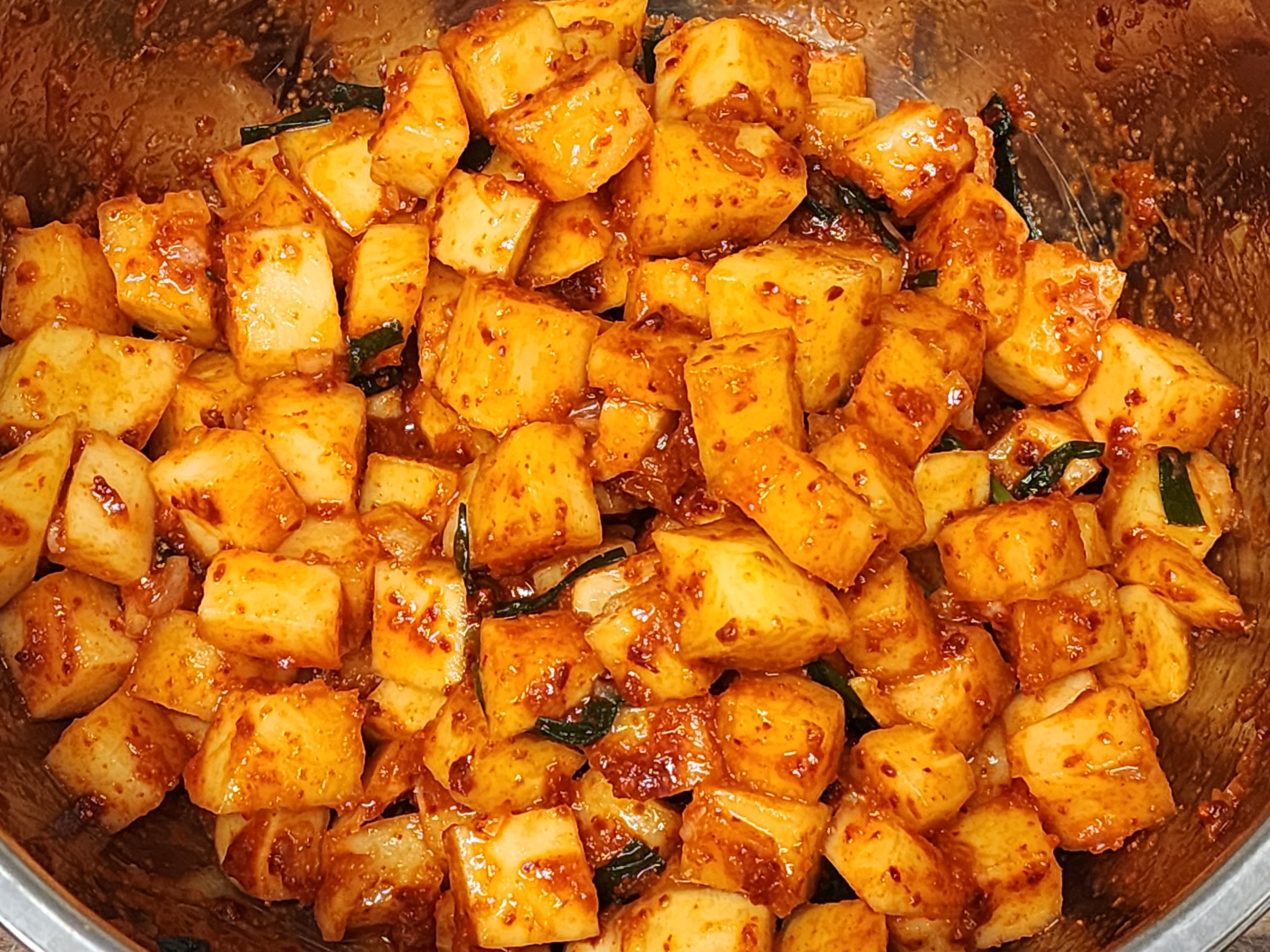 깍두기를 맛있게 만들려다 실패하는 가장 흔한 이유가 “무를 너무 세게 버무려서”입니다. 무가 상처를 많이 입으면 숙성 중에 수분이 빠르게 나오고, 아삭함 대신 흐물한 식감으로 가기 쉽습니다. 사진의 결과물처럼 큐브 모서리가 비교적 살아있다면, 코팅하듯 섞는 방식으로 잘 진행된 상태로 보입니다.