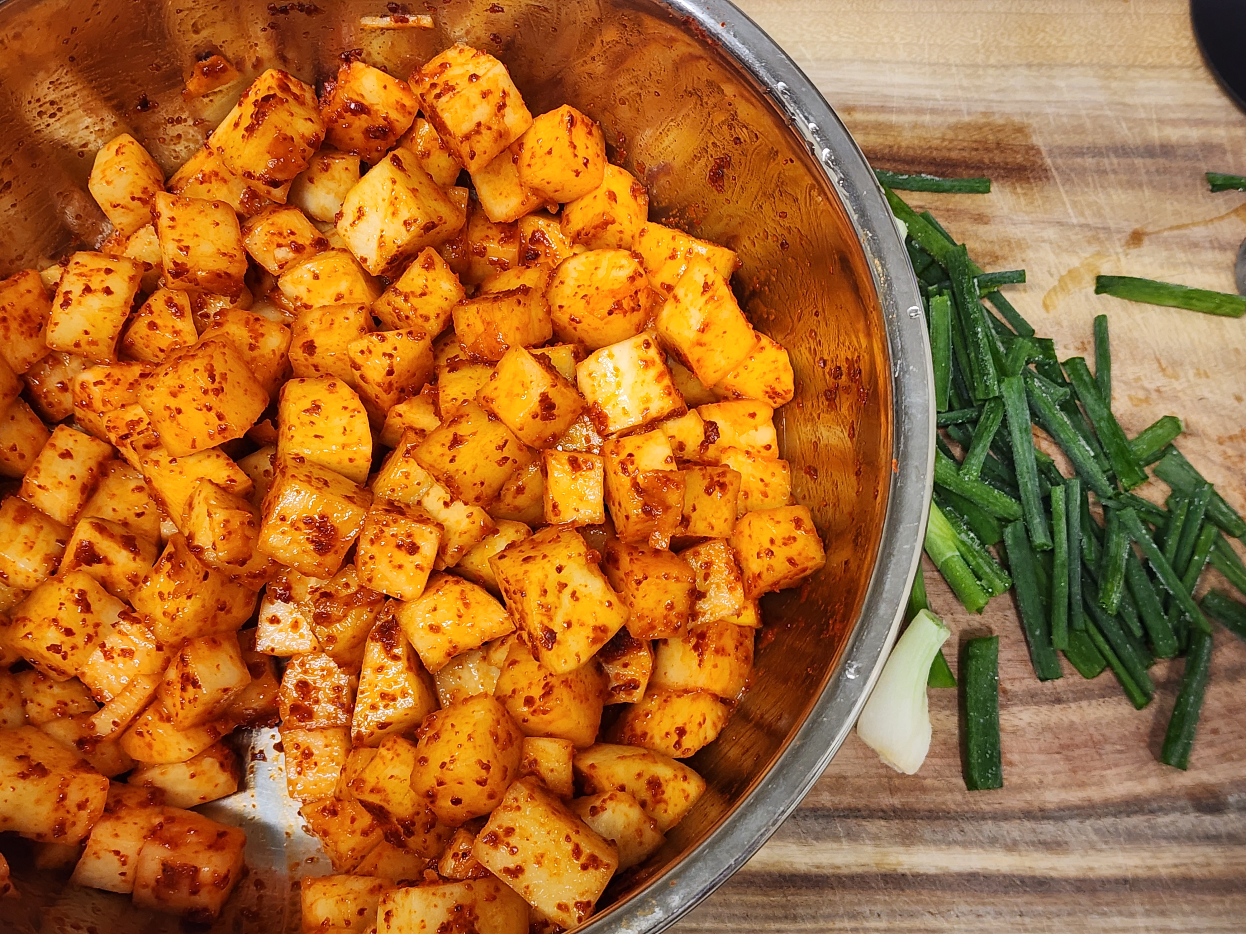 깍두기에서 가장 중요한 성과 지표는 “씹을 때 무가 부서지지 않고, 양념이 안쪽까지 스며들어 있는가”입니다. 이걸 만족시키려면 무 큐브 크기와 절임 시간을 표준화해야 합니다. 사진 속 무는 너무 작지 않게 일정한 큐브로 썰려 있어, 숙성 후에도 모서리가 살아있을 확률이 높아요.